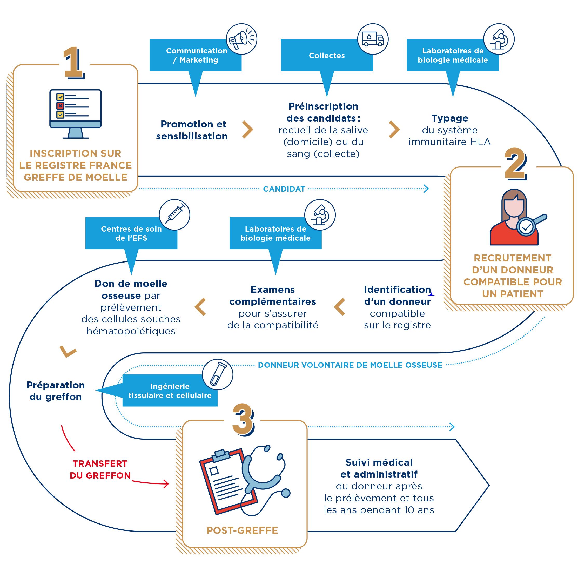 Lorsqu’une greffe est décidée par le corps médical, dans un quart des cas, ce sont les frères et sœurs du patient, compatibles, qui peuvent effectuer ce don de vie. Mais dans les autres situations (75% des cas), c’est un donneur volontaire qui est sélectionné. Recruter sans cesse de nouveaux donneurs de moelle osseuse est donc indispensable pour accroître les chances de compatibilité et donc de survie pour les patients. Aux côtés de l’Agence de la biomédecine (ABM), l’EFS est un acteur majeur de cette chaîne de solidarité.