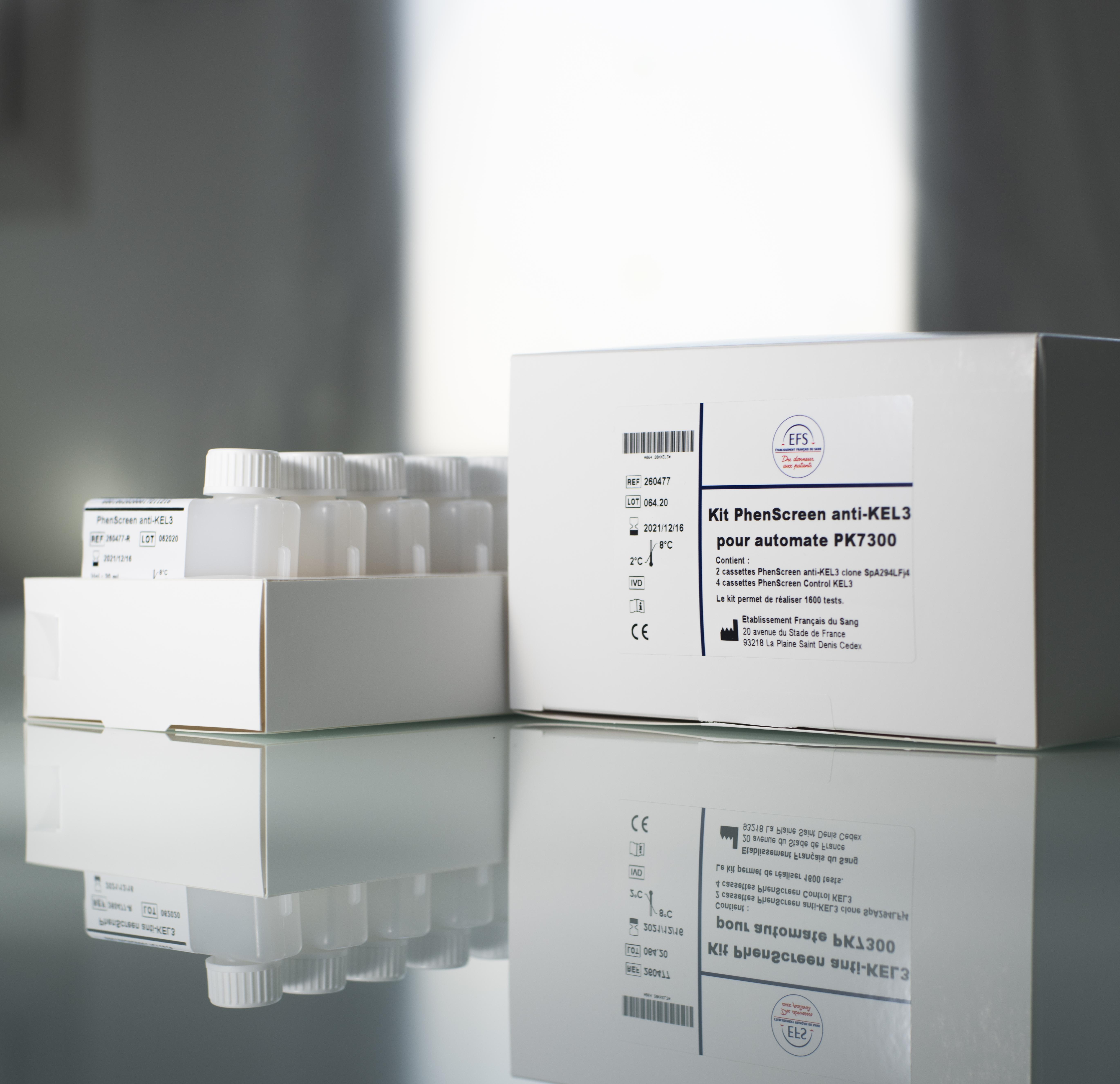 2 cassettes de 20 ml de réactif anti-KEL3 et 4 cassettes de 20 ml de Phenscreen Control KEL3